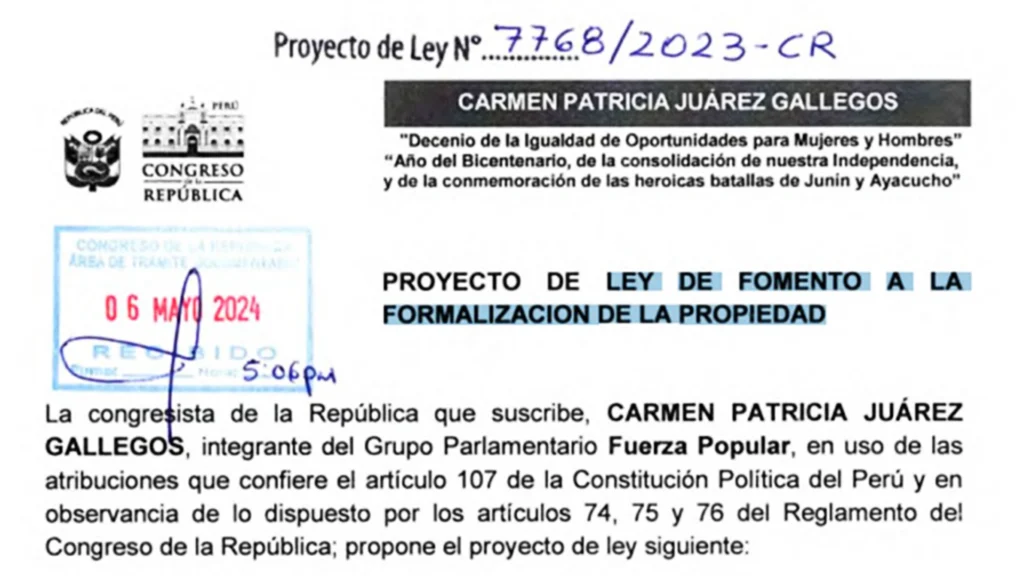 La propuesta legislativa N° 7768, presentada por la congresista Patricia Juárez el 6 de mayo, mejora el proceso de formalización de terrenos que fueron adquiridos por invasores a propiedades de instituciones estatales como universidades y municipalidades, lo que beneficia a los propietarios de terrenos informales.