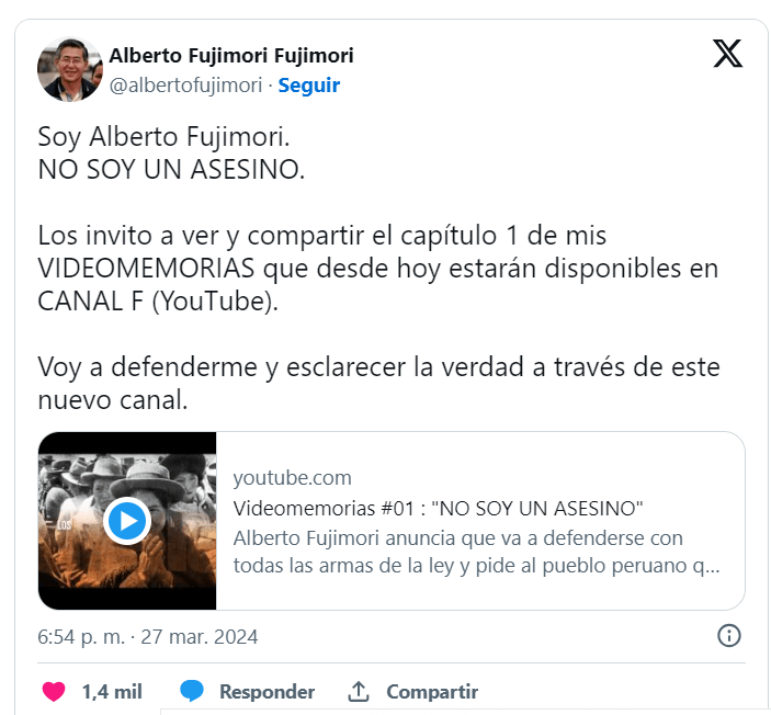 Poco después de haber salido del centro penitenciario de Barbadillo, el expresidente Alberto Fujimori ha publicado su primera videomemoria en su canal de YouTube, titulado «No soy un asesino».