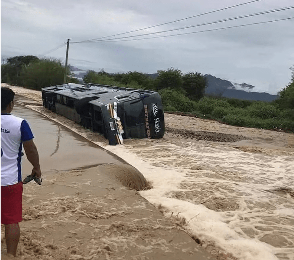 En Motupe Chiclayo, un Bus de Pasajeros no logró cruzar río y se volteó. El Bus de la empresa Emtrafesa no consiguió pasar el fuerte caudal que se ha formado entre Jayanca y Motupe. Tres personas fueron recatadas, entre ellos una menor de edad. Se pide a los transportistas tomar medidas de seguridad.